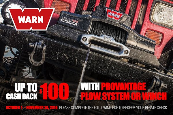 Stay on the safe side, during the long winter months with our great combo of WARN must-have winter accessories. Till November 30, 2016 purchase WARN Winch or Plow System and GET $50 rebate check or buy both and GET $100 Rebate check.