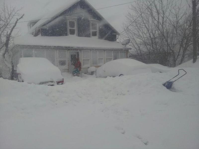 a few inches fell while we were shoveling it out... the neighbour across the street is parked in the driveway, he cant make it up the hill until they plow it out... but theres no plows on the road at the moment...