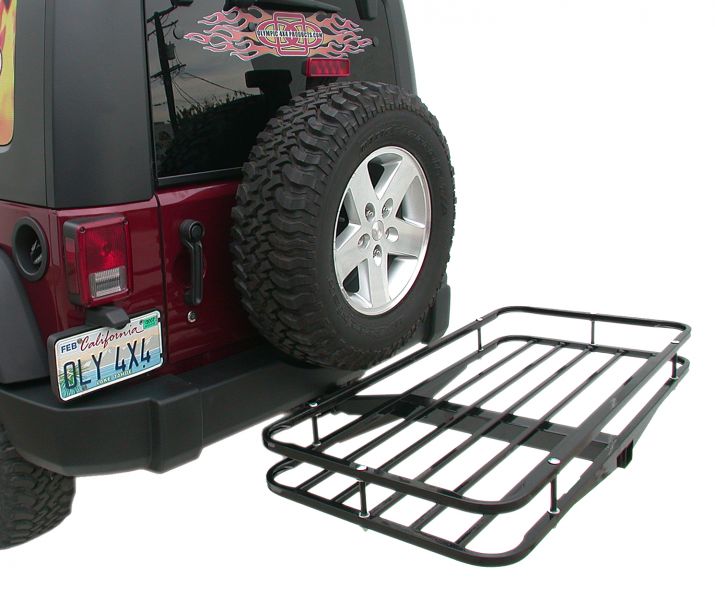 If you have a jku, you of course remove the spare put that inside,. and make a mount for the cans outside. For a receiver rack, copy something like below. It sits lower than the tailgate, you either remove the cans to open the gate or depending in the thickness of the cans, lay them on their side and see if it clears when opening the gate. If your fabricating rack you can make it low enough your self to achieve the clearance. But all of that kills your departure angle if you expecting any slight off-roading etc.