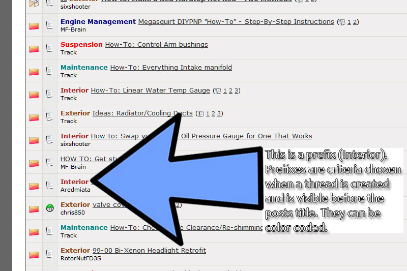 Prefixes can be searched and sorted. This becomes very useful on very active sites with prefixes. MiataForumz.com can be sorted to show only the prefix you are interested in. For instance I have sorted by the prefix interior, here are the results.