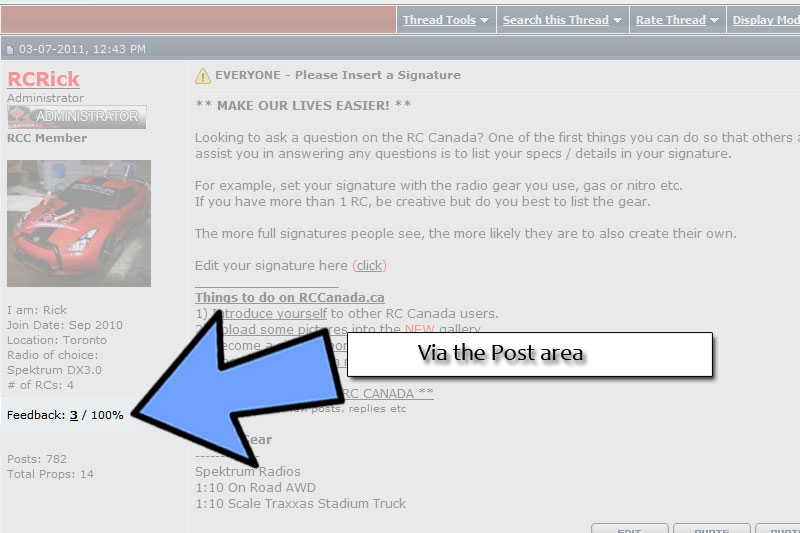 Feedback can also be seen in the post area (referred to as postbit). It generally shows how many transactions have taken place & the % of successful deals. In this example there has been 3 deals for 100% success / positive feedback.